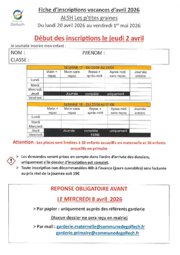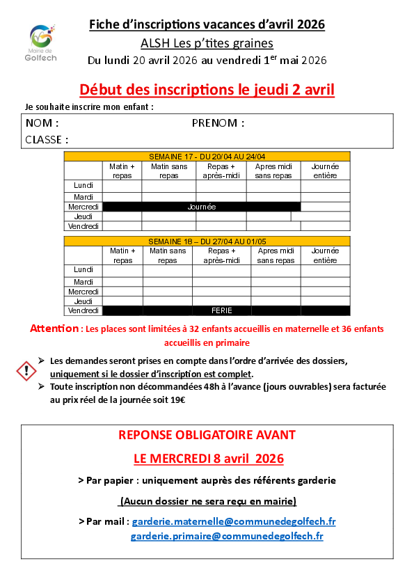 « Le dossier d’inscription à la garderie est le même que le dossier d’inscription à la cantine . Vous pouvez le télécharger :
