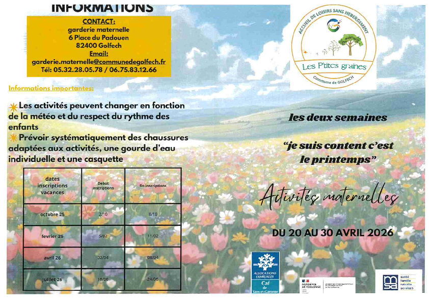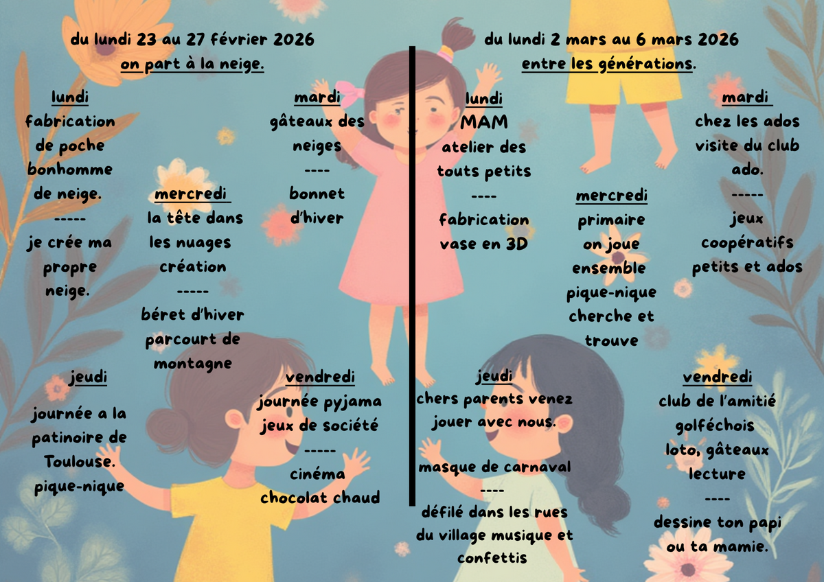 Pendant les vacances scolaires, un centre de loisirs sans hébergement agréé SDJES, partenaire CAF et MSA, accueille les enfants scolarisés à l’école de GOLFECH selon les modalités suivantes :