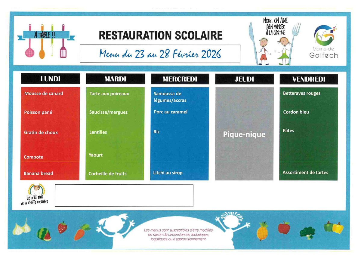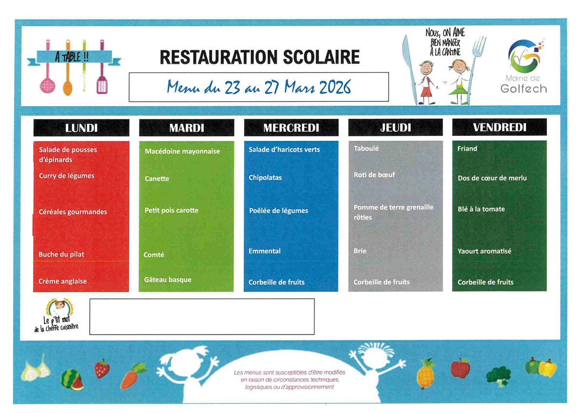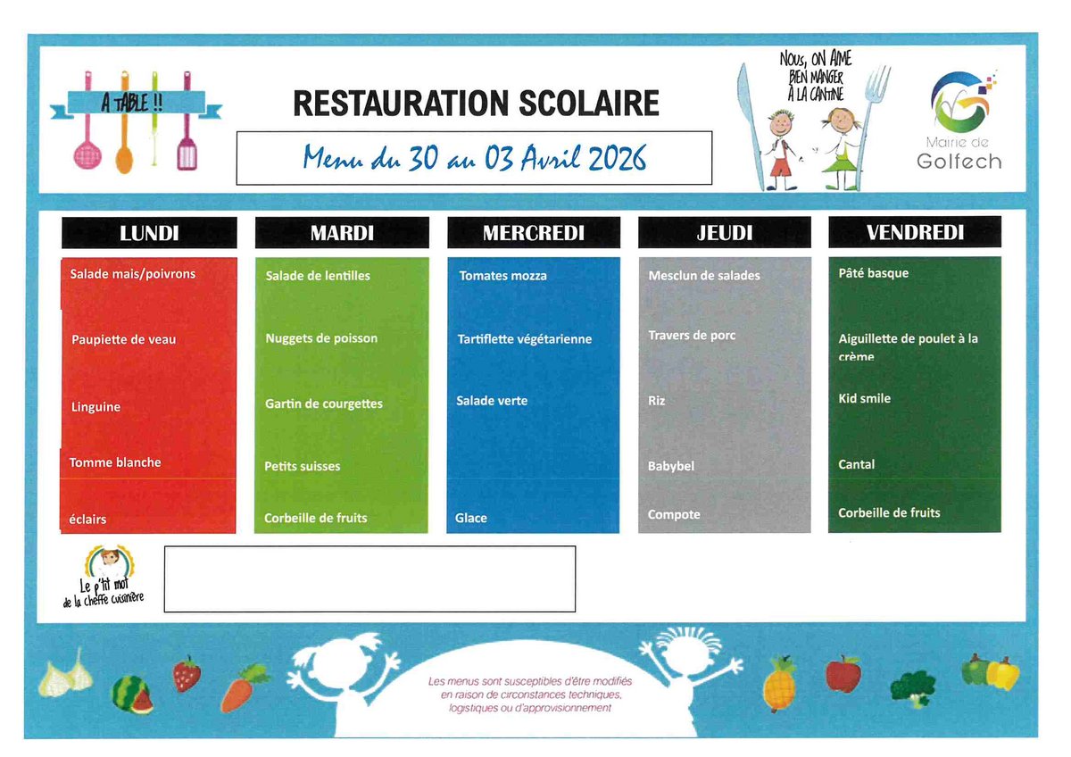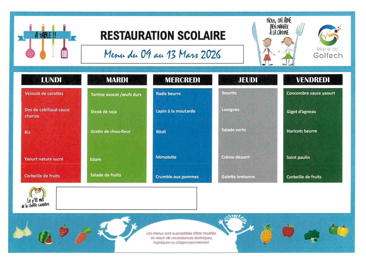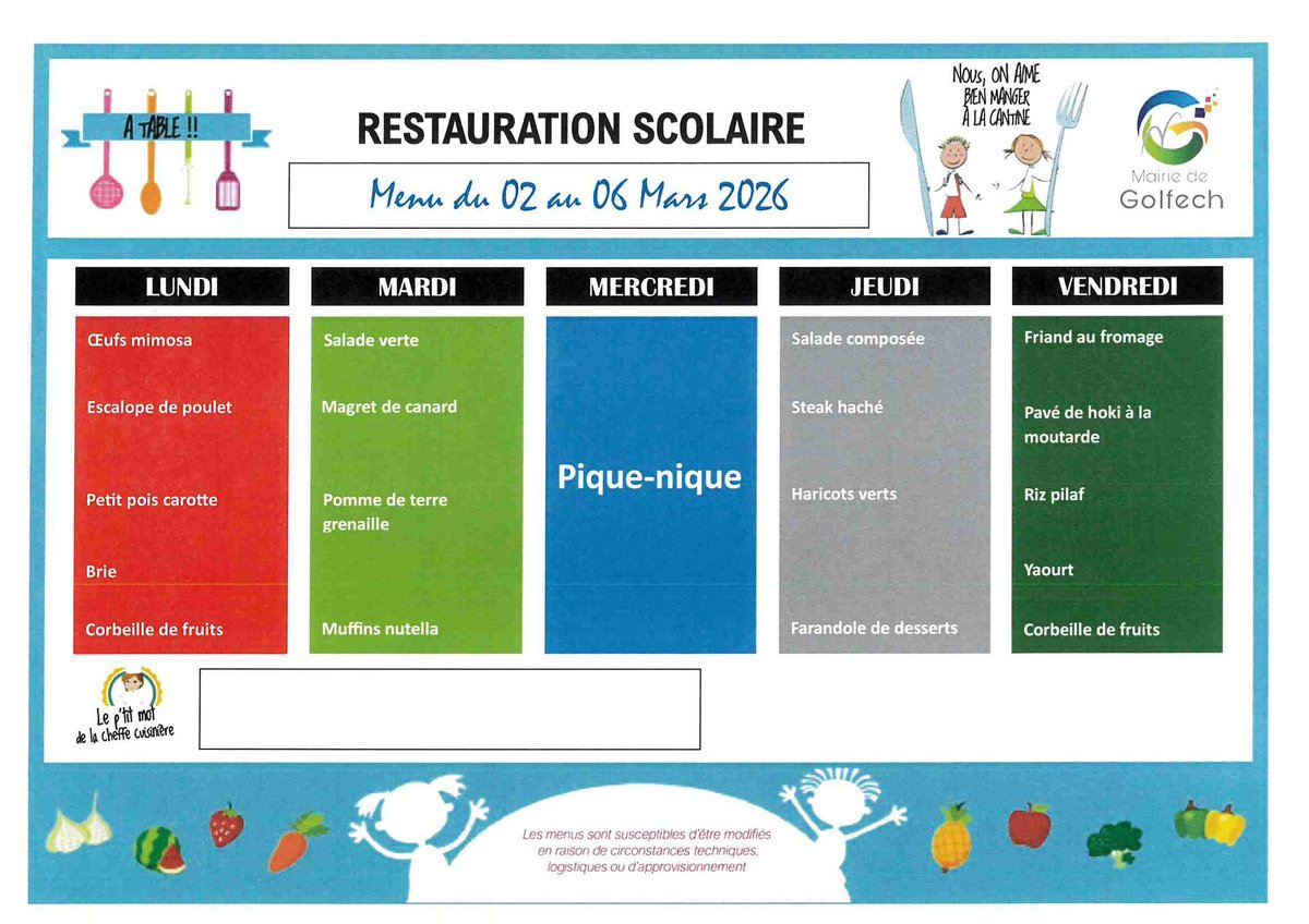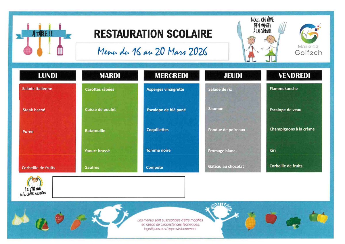 Les repas sont confectionnés sur place en respectant les conditions d’équilibre alimentaire et d’hygiène exigées. Les menus sont diffusés sur le site de la commune et sur les panneaux prévus à cet effet à l’école et en garderie.